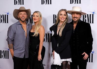 2025 BMI Country Awards - Arrivals NASHVILLE, TENNESSEE - NOVEMBER 18: Chris Lucas (L) and Preston Brust (R) of LOCASH, Kaitlyn Lucas and Kristen Brust attend the 2025 BMI Country Awards at BMI on November 18, 2025 in Nashville, Tennessee. (Photo by Tibrina Hobson/Getty Images) (Tibrina Hobson/Getty Images)